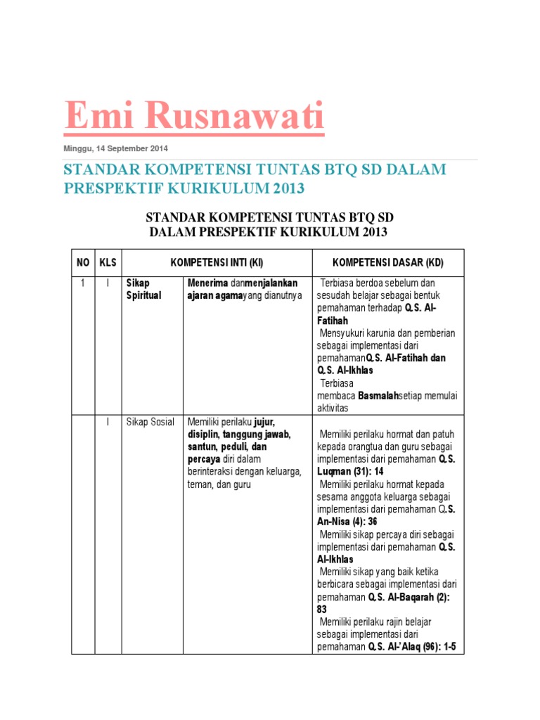 Kd Btq Kelas 1 Sd Semester 1 / Pemetaan Kd Ki 3 Ki 4 Kelas 2 Semester 1 Kurikulum 2013 Ayo Madrasah - Pemetaan kd kelas 5 semester 2 kurikulum 2013 sekolahdasar net. Format daftar nilai penilaian sikap kurikulum 2013. Untuk mengembangkan silabus pai sd kelas 2 semester 1 kurikulum 2013 dibutuhkan beberapa langkah sekaligus. Daftar nilai kelas 2 semester 1. Administrasi yang kami bagikan yaitu berupa download pemetaan ki dan kd kelas 1 terbaru untuk semester 1. Silabus plh kelas xi kd fiqih kelas 1 sd semester 1 silabus btq kelas 6 semester 2 rpp sd mtk persen dwonload apk kepala sekolah for pc contoh deskripsi nilai raport agama kristen kelas 9 smp k13 semeser ganjil rpp pembelajaran tentang siklus hujan rpp kelas 5 kd 3 4 bahasa indonesia soal true or false pelajaran ips nuat anak sd.
